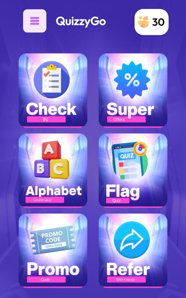 - Har feature alag tile me hai (Check-In, Offers, Alphabet, Flag, Promo, Refer)