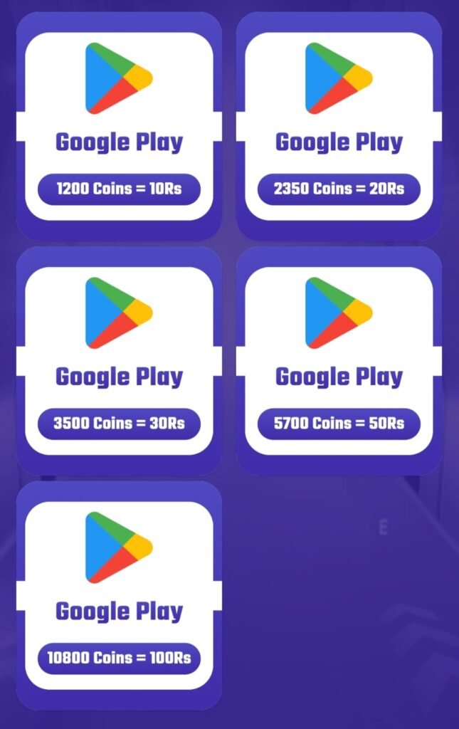| Google Play Voucher | 10800 Coins | ₹100 |